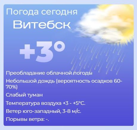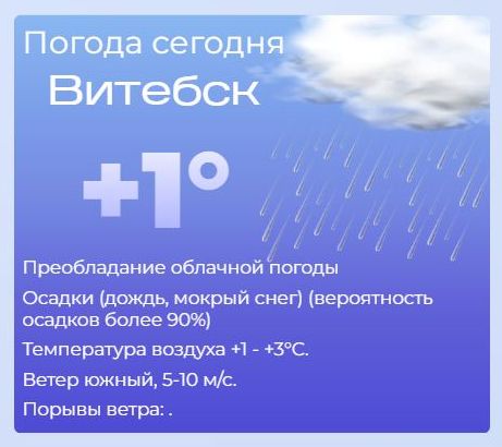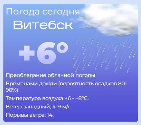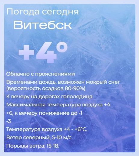 Сегодня утром — облачно с прояснениями, дождь и мокрый снег (вероятность осадков 80–90%), к вечеру ожидается резкое похолодание. Утром: +4…+6°C, вечером: до –1…–3°C. Ветер: северный, 5–10 м/с, с порывами до 15–18 м/с. Осторожно! К вечеру: на дорогах и тротуарах — гололедица! Будьте предельно осторожны за рулём и пешком.