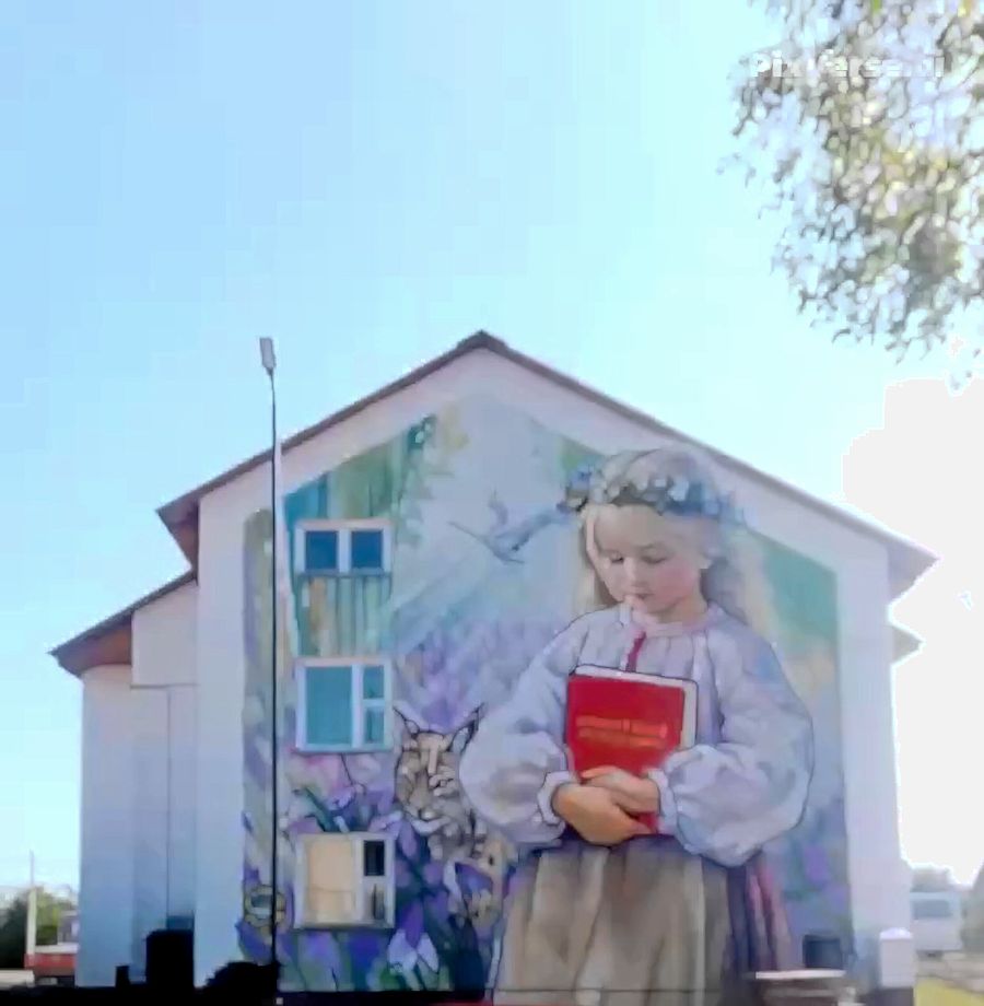 В деревне Домжерицы Лепельского района на стене одного из многоквартирных домов появился мурал девочки в народном костюме с Красной книгой Республики Беларусь в руках