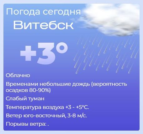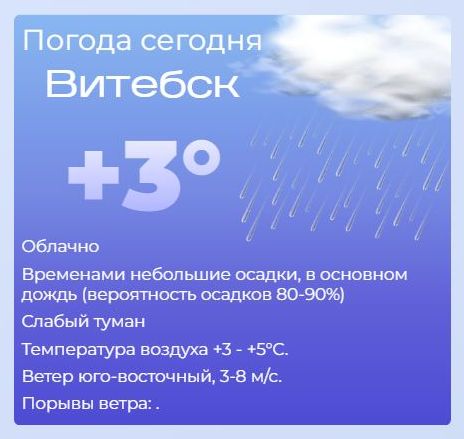 Сегодня — облачно, временами дождь. Вероятность осадков — 80–90%. Утром возможен слабый туман — будьте внимательны на дорогах и при переходе улиц. Температура: +3…+5°C. Ветер: юго-восточный, 3–8 м/с.